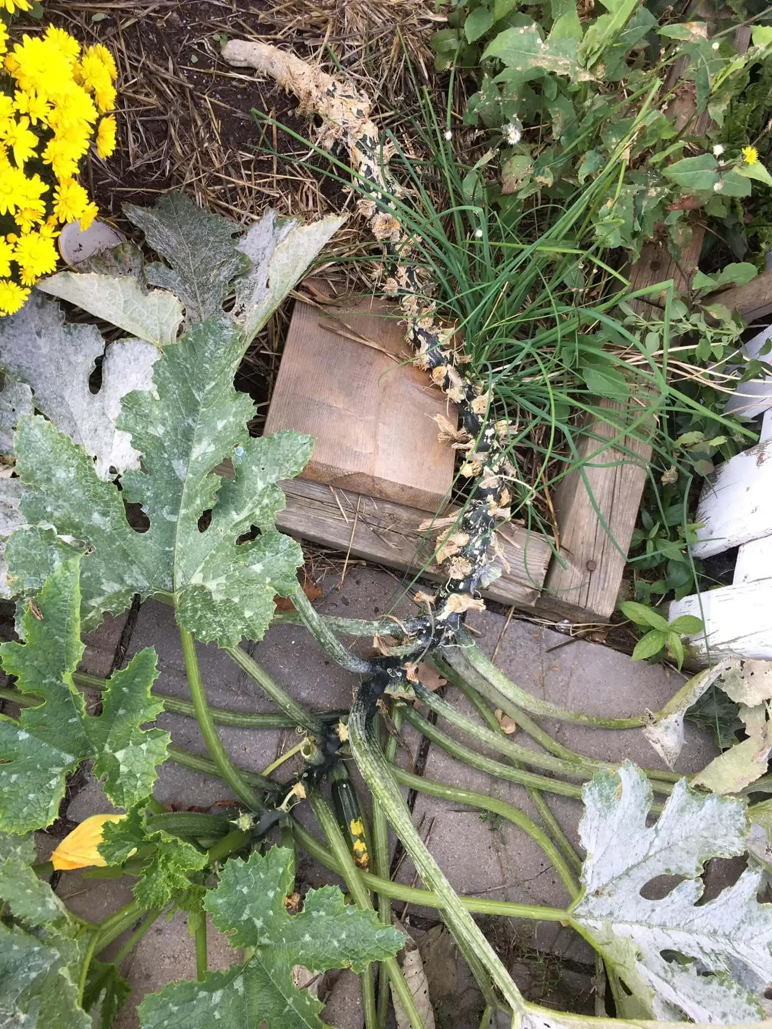 Eventually, the plant outgrew the tomato cage and I was afraid being in a cage would break the zuchinni plant - so I did some tomato cage surgery and rested the plant on 2x6s (I don’t know wood sizes) - and it KEPT GROWING!! So I let it crawl across our walkway and asked our tenants to walk around it…and it kept going until frost.