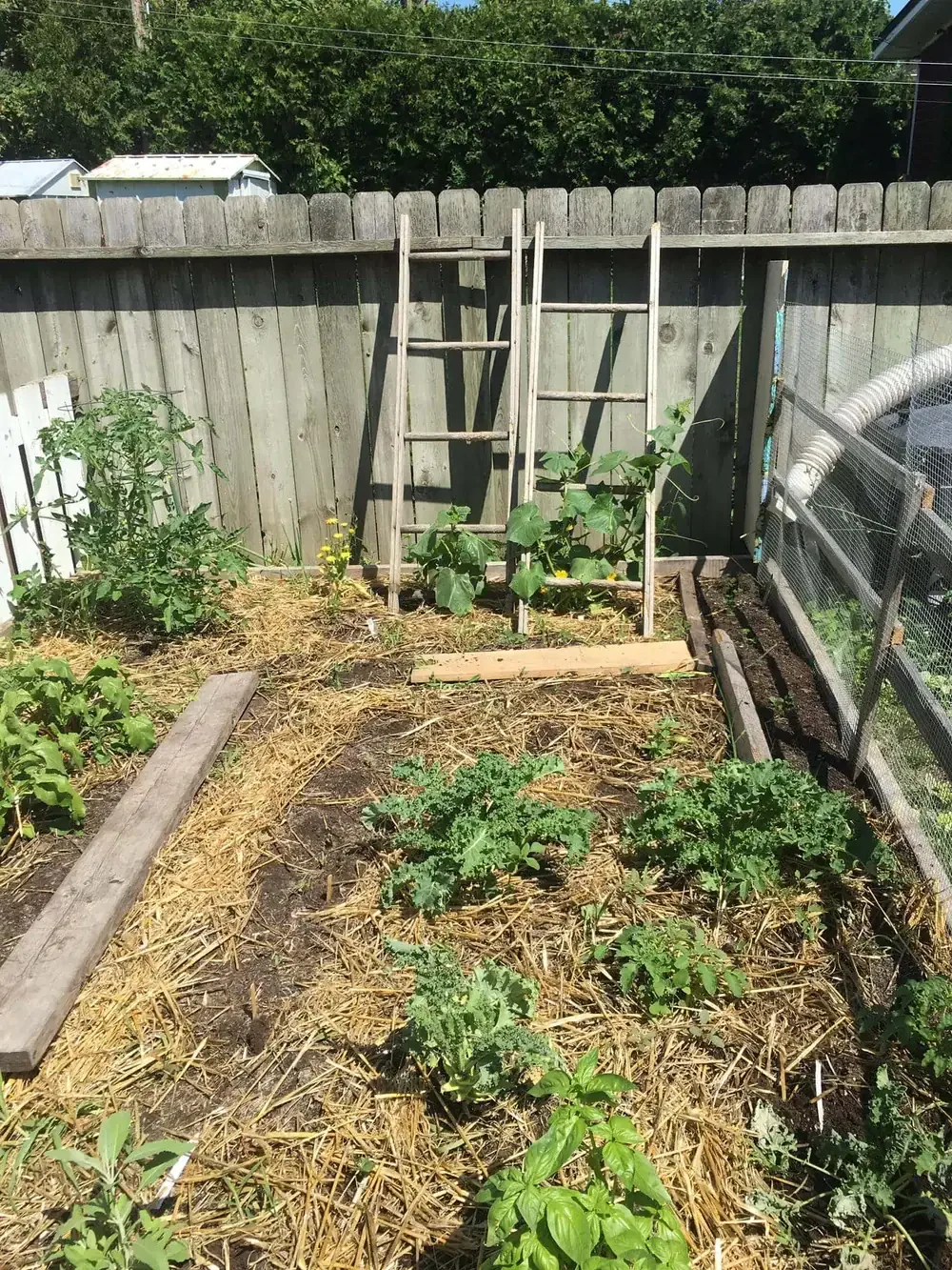 We needed to create some fencing around our kitchen garden due to a golden retriever who insists on eating all the vegetables and because he has a particular love of cucumbers and tomatoes. We turned that challenge into a solution - now we grow beans up most of the fences and the dog only gets the ones on the outside!